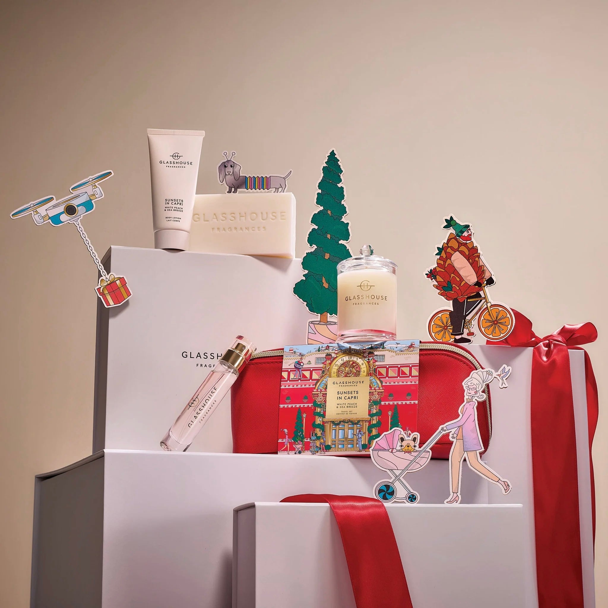 Contains: 1 x 14mL Eau de Parfum, 1 x 60g Soy Candle, 1 x 180g Body Bar & 1 x 50mL Body lotion all wrapped up in a festive cosmetic case with joyful illustrations by Aeoniumsky